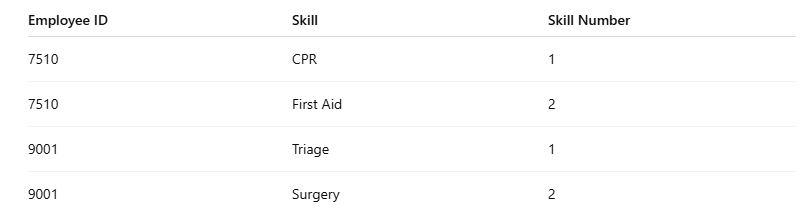 Each employee can have multiple skills, and we need to assign a sequential skill number for each employee.